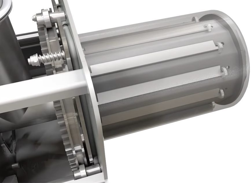 Ο θάλαμος καύσης είναι τοποθετημένος σε τέσσερα έδρανα σχεδιασμένα έτσι ώστε να μπορεί να περιστρέφεται σε όλες τις φάσεις λειτουργίας του. Η συνεχής περιστροφή της εστίας απομακρύνει συνεχώς την στάχτη και δεν επιτρέπει την συσσωμάτωση της (clincer) διατηρώντας την συνεχώς καθαρή.